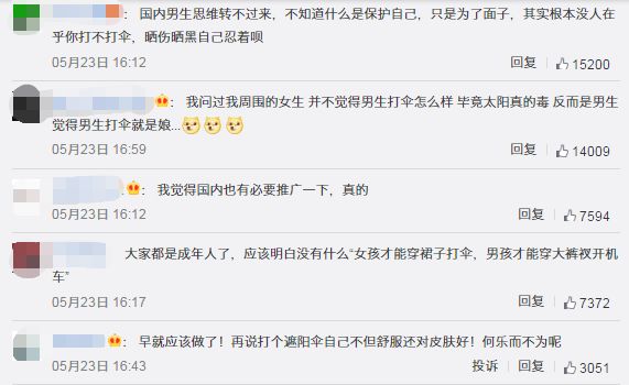 此視頻發布后,中國網友對日本政府推崇男士打傘的事件這般評論:“有些男生只是好面子才不打傘,非常多女生并不會覺得男生打傘怎么樣,相反非常多男生會認為男生打傘便是娘。”“打遮陽傘不僅舒服還對皮膚好,何樂而不為呢?”