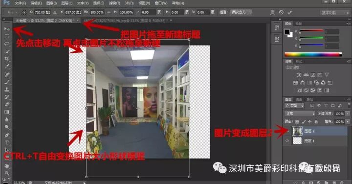 4將打開照片拖到新建文檔里面;為圖層2;變換照片體積CTRL+T,使照片體積適合圖層1規格體積。修改后運用裁切工具裁切,再刪除圖層1;