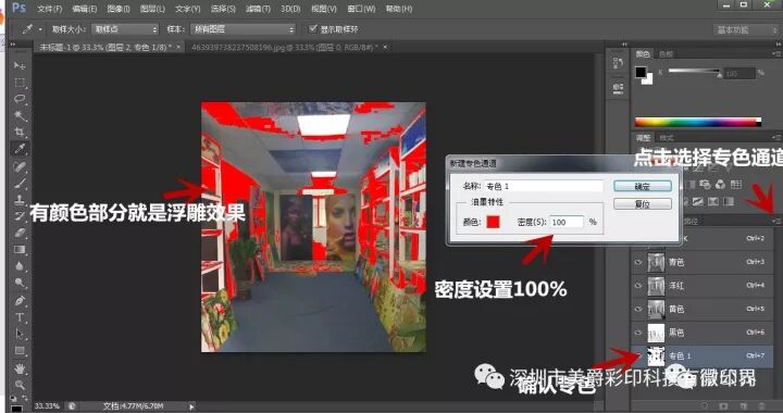 6選取專色通道,螞蟻線以內有顏色部分便是浮雕,密度設置100%